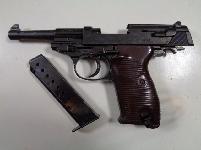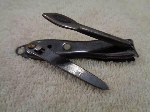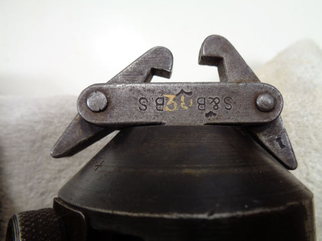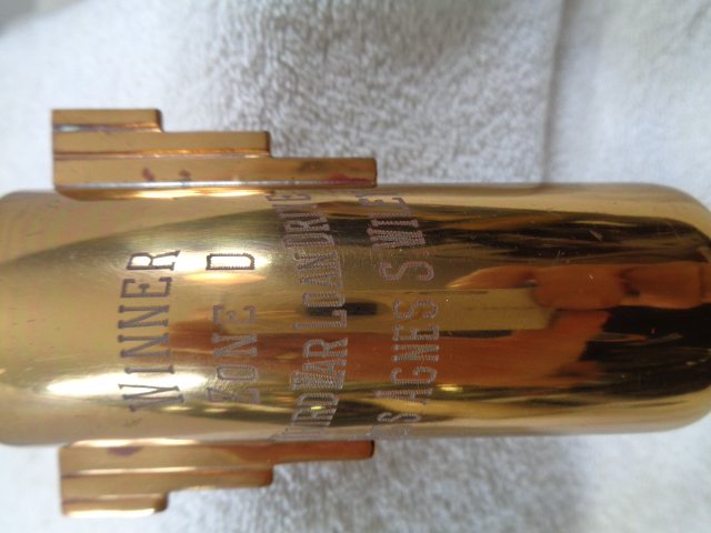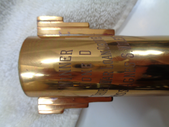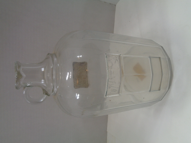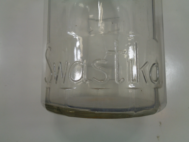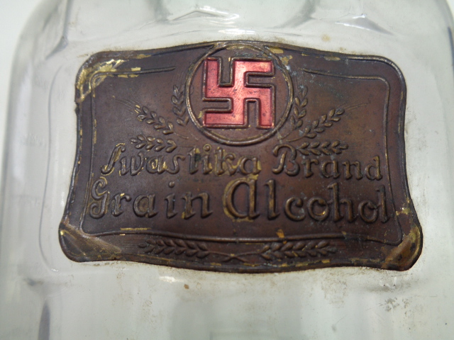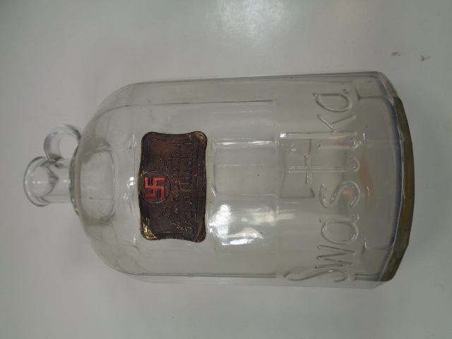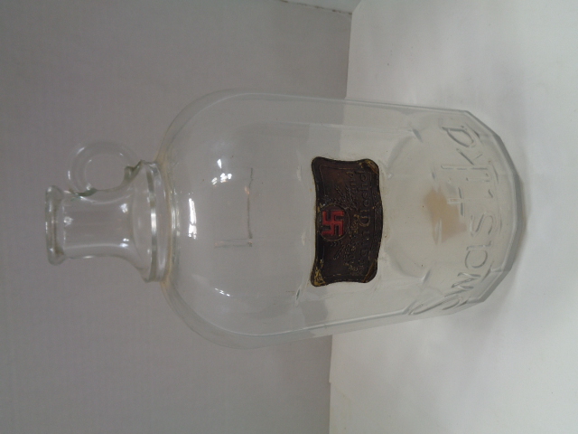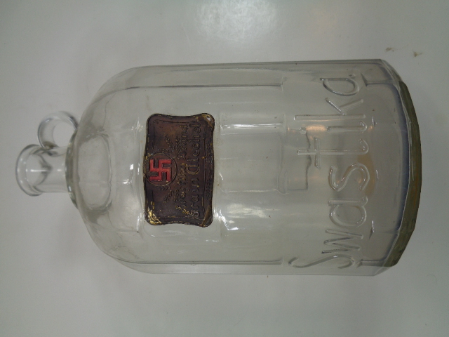 Not military and not from Germany, but a large glass bottle for Swastika Brand Grain Alcohol which has a thin brass tag on the front and the name "Swastika" embossed on the lower front of the bottle. It is one gallon and measures 11" high by 6 1/2" in diameter. There are embossed pint measurements on the one side that total 8 pints. Just a neat looking bottle.