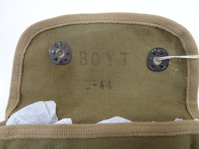 I have two of these kits available. The upper kit has it's original box from the manufacturer, "Military Kit by Belding - Corticelli" it is full, made of a leatherette material and near mint condition, priced at $45. The lower kit is a hard canvas kit with all of it's contents and in near mint condition. It is priced at $35.