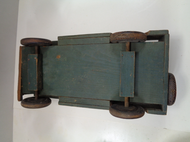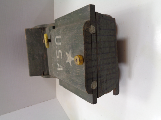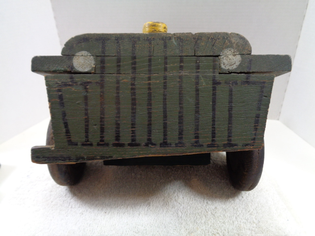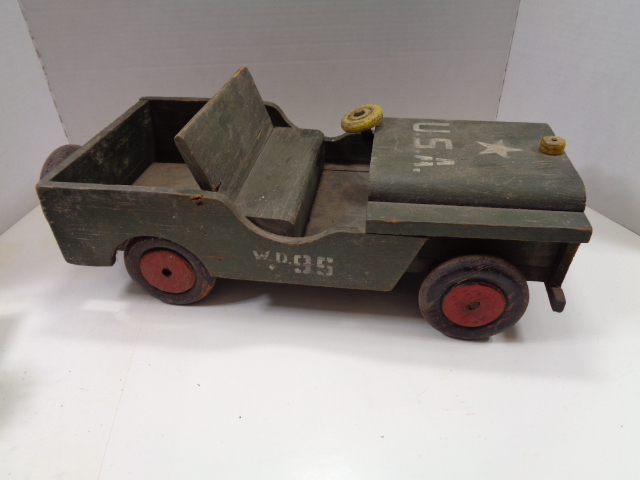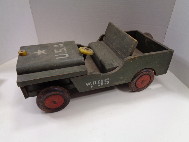Have a great looking homemade WW2 Jeep, measuring 17" long by 7 1/2" wide by 6 1/2" high. It is all wood construction, axels, 4 wheels and a spare and the only damage I see is the front bumper was broker long ago on the driver's side, but only gives it character. Still has the original paint and is a great looking homefront toy.