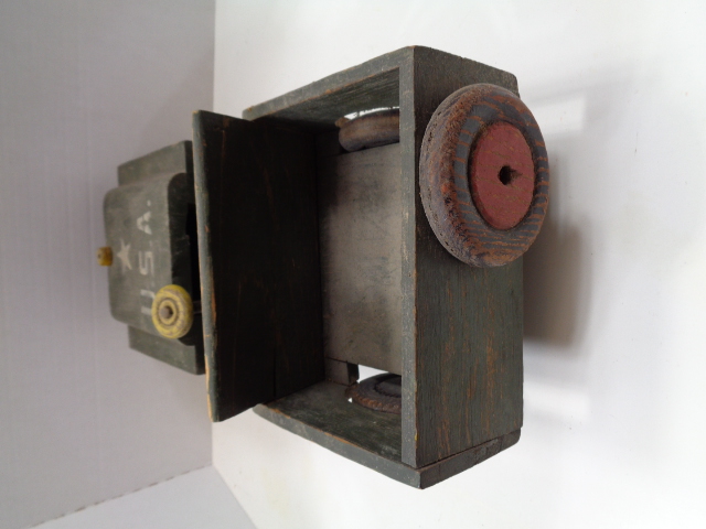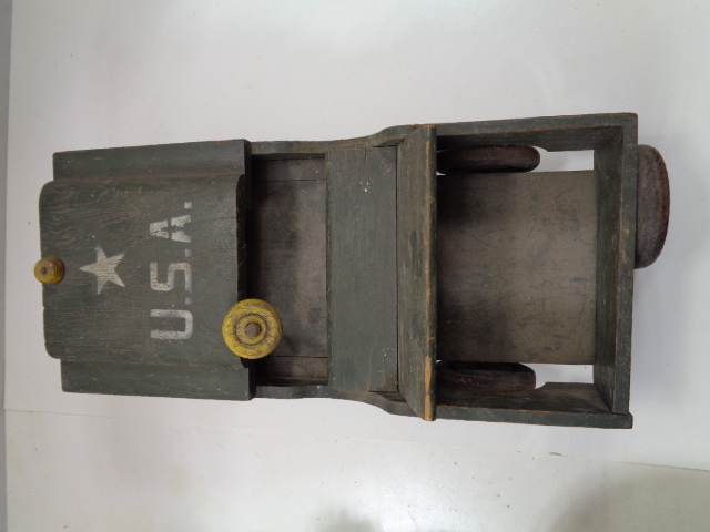 Just a fantastic find, as these type machine/games are incredibly hard to find. The game is 22 1/2" long, 11 1/2" wide and 14 1/2" tall at the tallest end. The aluminum pistol shoots pennies, or dimes and is in excellent working order. There is a key for the back door to retrieve the money that builds up inside. The object is to shoot a coin into Hitler's mouth, if it does you get your coin back, otherwise the coin falls into the center slot and will be retrieved by operator later. Still in excellent overall shape. There were very popular in bars, restaurants, soda shops and drug stores as a way the owner could make some extra money during war times.