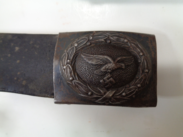 These items came to me as you see them. I don't see any markings on the belt or buckle, the bayonet and scabbard are matching with "F.W. Holler" and "5959 b". The blade is mint and still has the bluing, the grip is a dark brown or black Bakelite and the lock for the rifle still works. The leather while just a little stiff, thick leather, it is still supple enough that it will not crack or break when bent. This is a great looking Luftwaffe rig that has been together for all these years.