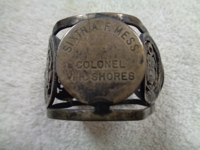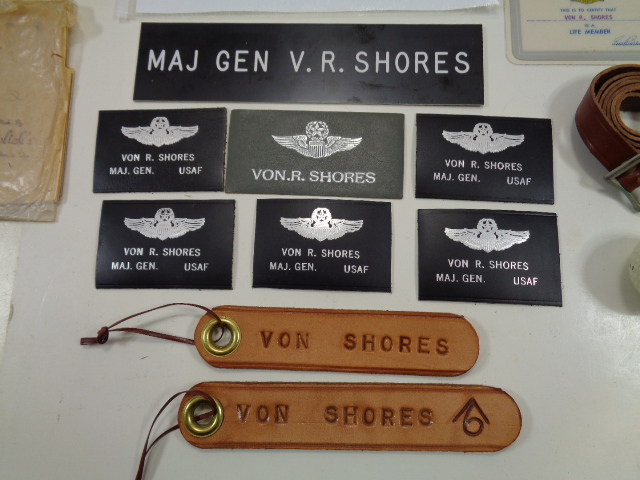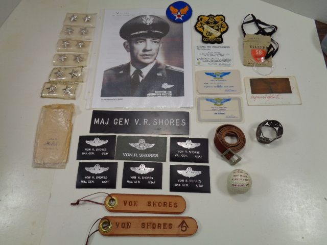 A neat little grouping of personal items to Maj. Gen Van R. Shores who graduated from West Point in 1936, was then assigned to the 29th Pursuit Squadron in the Panama Canal Zone, later flew 29 combat missions in Spitfires while with the 12th AAF and went on to a prominent career in the USAF holding many command offices. A short history comes with this grouping. Included in the grouping are some of his Maj. Gen. insignia, leather flight jacket name tags, patch and card to "Sigma Nu Fraternity", a golf ball with his name from McChord AFB 1962, a Sixth AF napkin ring with his name, when he was just a Colonel and some other personal items. Neat little grouping.