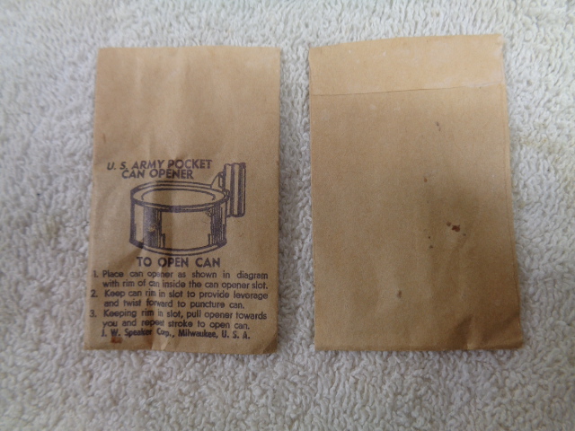 Have four P-38 can openers still in their original envelopes. Two by "Washburn Co." and two by "Speaker Corp.". They are sold at $8 each or two for $15. These are the only ones I have.