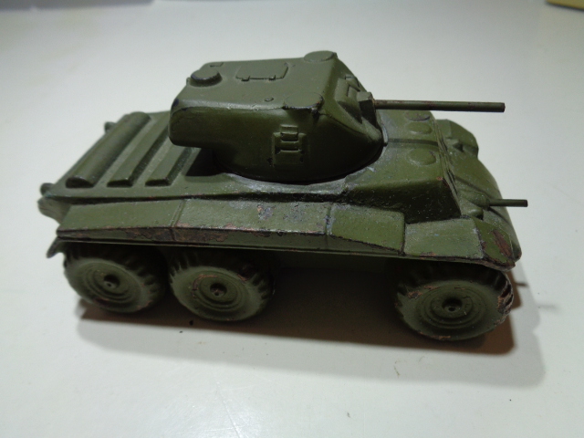 These are metal, cast models of the following vehicles. British - Camden Lloyd Carrier, 4 1/4' X 2 3/8" X 1 5/8", US - T-17 Armored Car, 5 3/8" X 2 3/4" X 2 3/8" with movable turret and a US - General Sherman Tank, 6 1/4" X 3" X 2 3/4" with 4 movable wheels underneath. The cannon barrel was replaced with a wooden dowel, but it looks like the original. These vehicles are sold at $65 each, or take all three for $180. Very hard to find, especially in this condition.