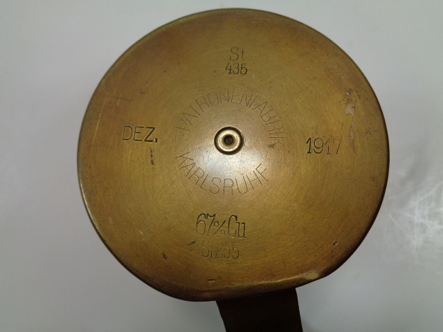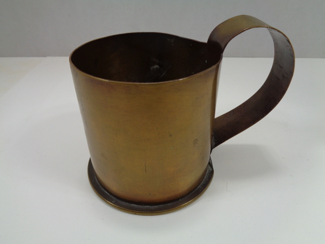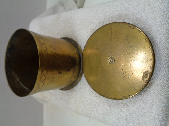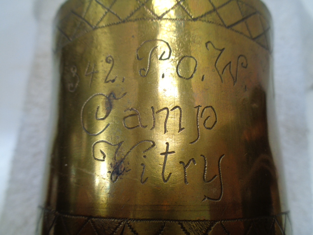 A super neat covered brass trench art receptacle, dated 1917 on base and on lid, with engraving, "First Aid Nursing Yeomanry" and the organization's emblem on one side, with "342 P.O.W. Camp Vitry" on the other side. Both the base and lid are dated 1917. The FANY were an all female British unit that drove ambulances, mobile kitchens and showers, etc. and also transported the dead and wounded. Many of these women won various British and French decorations for their actions. Neat women's item you rarely see.