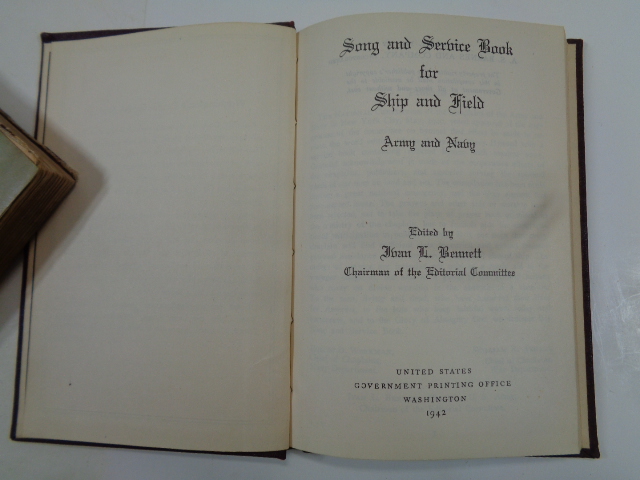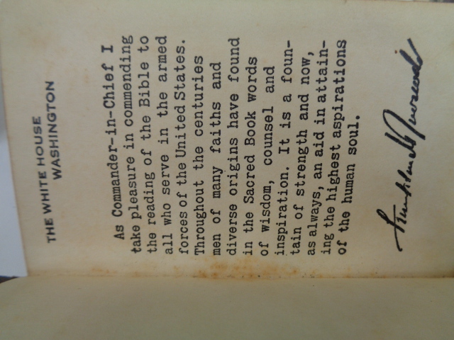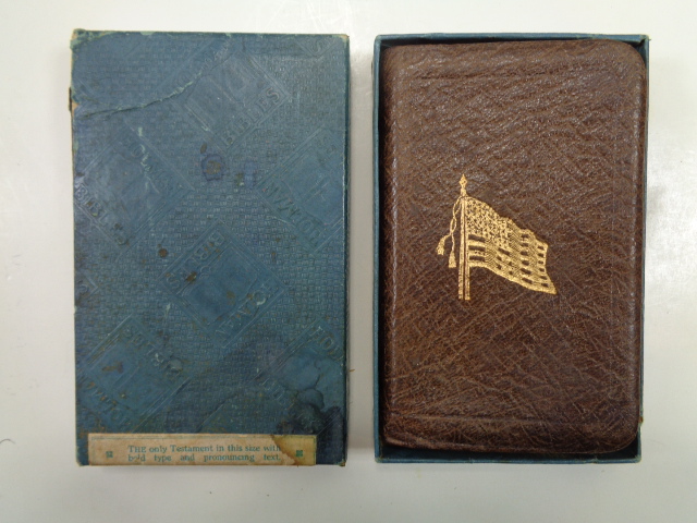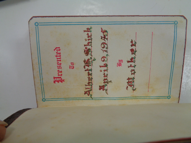 The box measures approx. 3 1/3" by 5 1/2" and holds a New Testament by Holman of Philadelphia. This book was given to Albert H. Shirk of Grantville, Pa. by his mother on April 9th, 1945 as he was ready to be sent to the Pacific Theater while serving in the Signal Corps. Following the end of the war, he stayed in Japan with the occupation forces helping to reestablish communication lines, Included are two pieces of Japanese paper money he brought back.