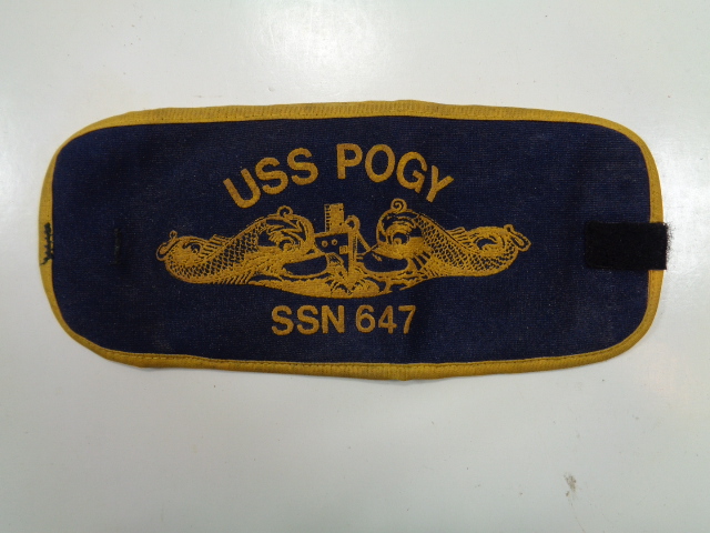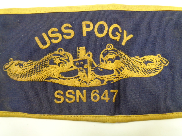 A super neat looking armband measuring approx. 4 1/2" wide by 10" long, embroidered on cloth with a cheesecloth backing and what appears to be a place to put ID, or papers on the reverse. It is missing the elastic strap and has a couple of small pieces of Velcro sewn on. Obviously done after the war. The POGY had a pretty good war history with 16 Japanese ships sunk between April 1, 1943 and August 5, 1945. First one of these armbands I've ever seen. Overall in great shape.