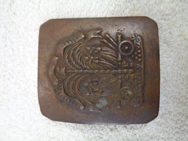 A great looking brass buckle for the enlisted men serving at the Haitian Constabulary from 1916 to 1920. These men were protecting US interests in Haiti during this period. It is marked with an "HB" on the reverse. A rather tough USMC item to find and in excellent condition.